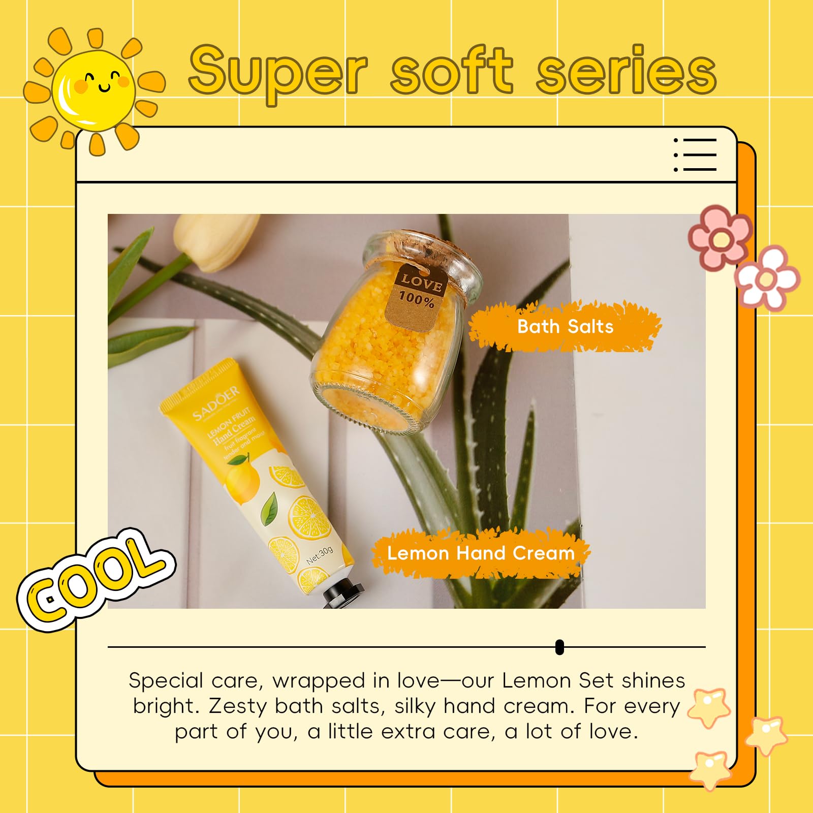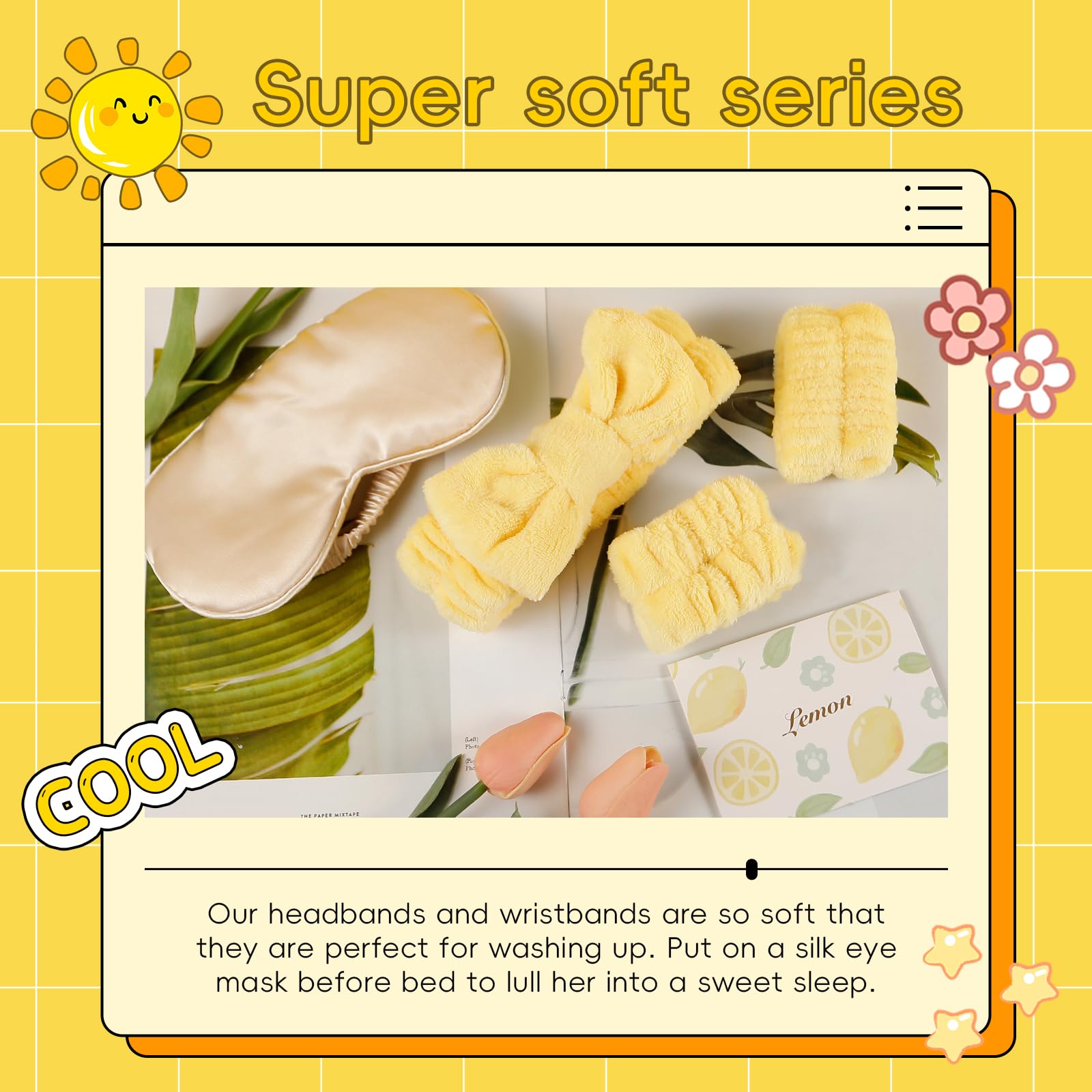 - Perfect Gift for Women: Our lemon-inspired gift basket features a vibrant, fun, and high-quality collection: 1 x Lemon Bath Salt, 1 x Lemon Soap, 1 x Lemon Hand Cream, 1 x Scented Candle, 1 x Silk Eye Masks, 1 x Chamomile Bath Salt, 1 x Headband + 2 x Wristbands, 1 x Beautiful Greeting Card